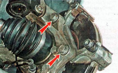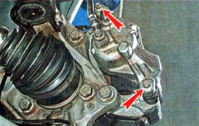 7. Накидным или торцовым ключом на 18 мм отворачиваем два болта крепления направляющей колодок к поворотному кулаку.