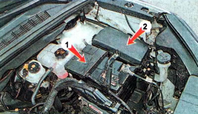 Предохранители, плавкие вставки и реле размещаются в монтажных блоках. В моторном отсеке расположены блок плавких вставок на аккумуляторной батарее 1 и блок предохранителей и реле 2 на левом брызговике.