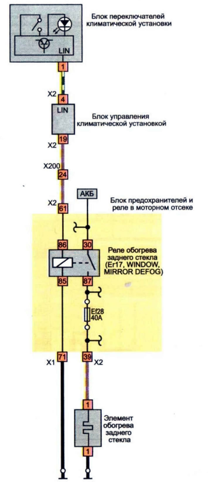 Схема включения обогрева заднего стекла и наружных зеркал заднего вида