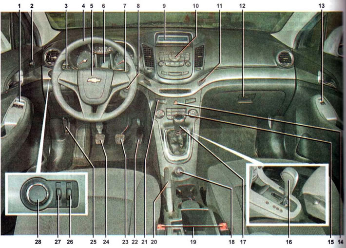 Расположение органов управления: 1 — блок управлении злектростеклоподьемниками; 2 — блок управления электроприводом зеркал; 3 —левый подрулевой переключатель (переключатель наружного освещения и указателей поворота); 4 — рулевое колесо; 5 — подушка безопасности водителя и выключатель звукового сигнала; 6 — щиток приборов; 7 — правый подрулевой переключатель (переключатель стеклоочистителей и стеклоомывателей); 8 — выключатель (замок) зажигания; 9 — информационный дисплей; 10 — панель аудиосистемы: 11 — выключатель системы курсовой устойчивости ESC*; 12 — ручка отпирания вещевого ящика; 13 — клавиша электростеклоподъемника двери переднего пассажира; 14 — выключатель аварийной сигнализации; 15 —блок управления климатической установкой; 16 — селектор режимов работы АКП*; 17 — рычаг переключения передач*; 18 — прикуриватель; 19 — замок ремня безопасности; 20 — рычаг привода стояночной тормозной системы; 21 — выключатель центрального замка; 22 — педаль газа: 23 — педаль тормоза; 24 — педаль сцепления*; 25 — рычаг привода замка капота; 26 — регулятор яркости подсветки щитка приборов; 27 — электрокорректор фар; 28 — блок управления наружным освещением