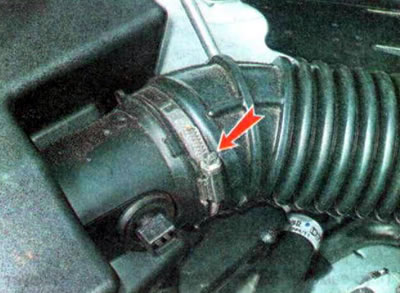 4. Тонкой шлицевой отверткой или ключом на 7 мм ослабляем хомут крепления патрубка дроссельного узла.