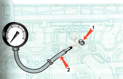 3. Останавливаем двигатель. Выворачиваем из головки блока цилиндров заглушку контрольного отверстия 1, и через специальный переходник 2, соединяем отверстие с манометром.