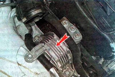 3. Устанавливаем домкрат под картер коробки передач. Немного приподняв коробку передач домкратом, разгружаем левую опору силового агрегата.