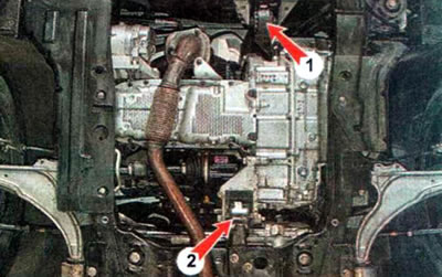 Для снижения колебаний силового агрегата при работе двигателя и во время движения автомобиля по неровностям дополнительно установлены нижние опоры: передняя 1 и задняя 2 (на фото защита картера двигателя снята).