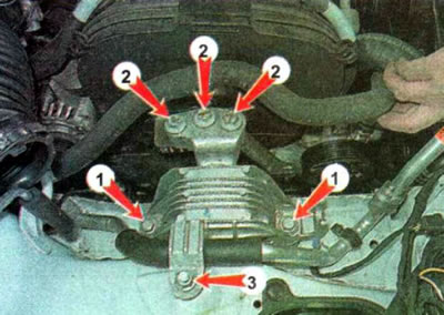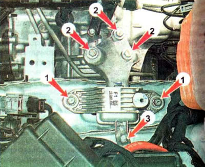 4. Ключом на 15 мм отворачиваем гайку 3 и два болта 1 крепления опоры к кузову, а затем три болта 2 крепления опоры к кронштейну двигателя.