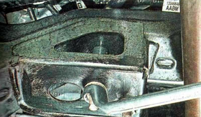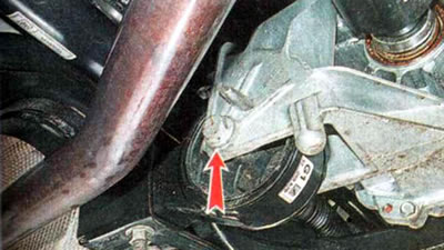 6. Устанавливаем детали в обратной последовательности. Болт крепления задней опоры к кронштейну коробки передач затягиваем моментом 100 Нм, гайки болтов крепления задней опоры к подрамнику — 110 Нм.