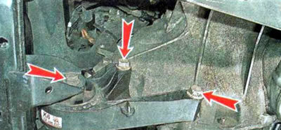 3. Ключом на 18 мм отворачиваем болты крепления опоры к МКП и кронштейну подрамника.