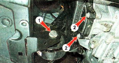 3. Ключом на 18 мм отворачиваем болт крепления опоры к кронштейну подрамника 1. Ключом на 15 мм отворачиваем три болта 2 крепления опоры к АКП (верхний болт на фото невиден).