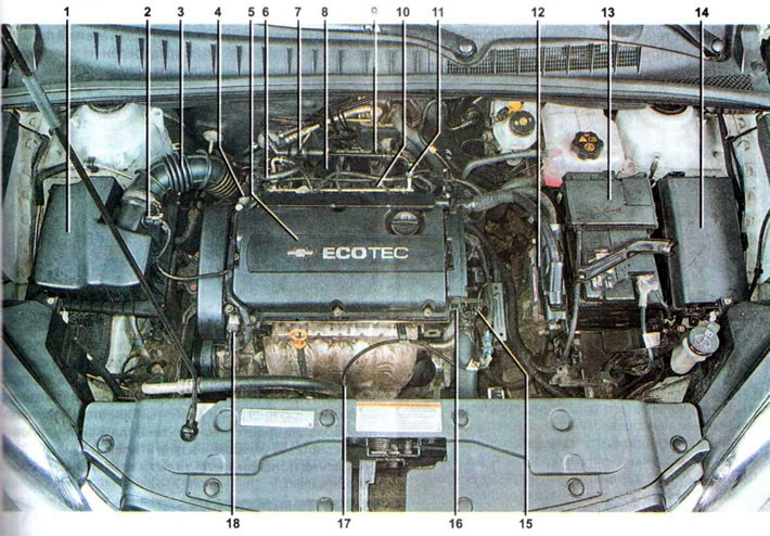Расположение основных элементов системы управления двигателем: 1 — воздушный фильтр; 2 — датчик температуры воздуха на впуске; 3 — воздухоподводящий патрубок; 4 - клапан изменения фаз распределительного вала впускных клапанов; 5 — модуль зажигания и свечи зажигания (под накладкой); 6 — шланг подачи топлива; 7 — клапан продувки адсорбера; 8 — впускной трубопровод; 9 — датчик абсолютного давления во впускном трубопроводе; 10 — топливная рампа с форсунками; 11 — штуцер для проверки давления в системе подачи топлива; 12 — электронный блок управления двигателем (ЭБУ); 13 — аккумуляторная батарея; 14 — блок предохранителей и реле; 15 — нагреватель термостата; 16 — датчик положения распределительного вала выпускных клапанов; 17 — датчик концентрации кислорода управляющий; 18 — датчик положения распределительного вала выпускных клапанов