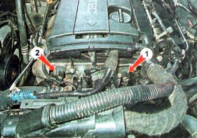 Датчики положения распределительных валов впускных 1 и выпускных клапанов 2 установлены в головке головка блока цилиндров с левой стороны.
