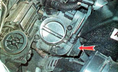 Датчик положения дроссельной заслонки объединен в одном корпусе с электродвигателем привода дроссельной заслонки и установлен на дроссельном узле (для наглядности снят воздухоподводящий патрубок).