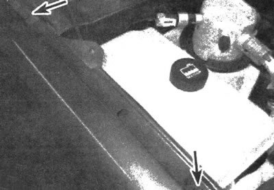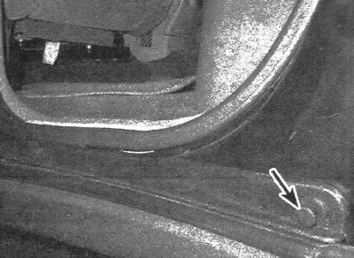 6. Выполняя процедуру из-под автомобиля, выкрутите болт крепления, расположенный спереди в колесной арке, болт, расположенный в левом нижнем углу, а также болт крепления крыла к косяку двери (см. иллюстрации).