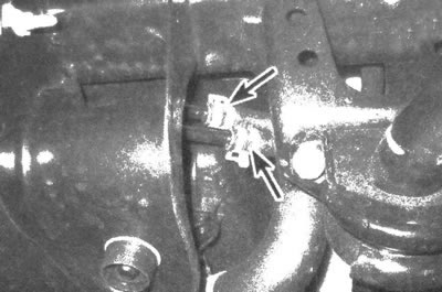2. Поместите под передком автомобиля сливную емкость и отсоедините от охладителя шланги гидроусилителя (см. иллюстрацию). Заглушите шланги охладителя, чтобы предотвратить засорение системы.