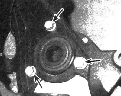 5. Выполняя процедуру с обратной стороны поворотного кулака, выкрутите из него болты крепления ступицы (см. иллюстрацию). Снимите щит диска.