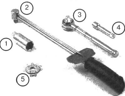 25.2. Приспособления, необходимые для замены свечей зажигания:1. Торцовая головка под свечу - На внутренней поверхности головки имеется специальное покрытие, предохраняющее фарфоровый изолятор свечи; 2. Динамометрический ключ - Желательно использовать при затяжке свечей для обеспечения надежности; 3. Рычаг с храповым механизмом - Стандартное приспособление в дополнение к торцовой головке под свечу. При выполнении процедуры на различных моделях необходимо использовать всевозможные удлинители и шарнирные секции, чтобы подобраться к одной или нескольким свечам с ограниченным доступом; 4. Удлинительный стержень - Для обеспечения возможности выкрутить или затянуть одну или несколько свечей зажигания (в зависимости от модификации автомобиля) могут понадобиться удлинители и универсальные шарниры; 5. Щуп для проверки зазора свечей - С помощью такого щупа можно контролировать зазоры свечей. Убедитесь в том, что щуп предназначен для контроля зазора свечей соответствующего типа.