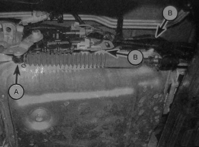 27.7. Отсоедините наконечник троса селектора от шаровой шпильки (А), затем выкрутите два болта, которыми крепится кронштейн троса к кожуху коробки (В) (при этом откроется доступ к болтам поддона коробки передач)