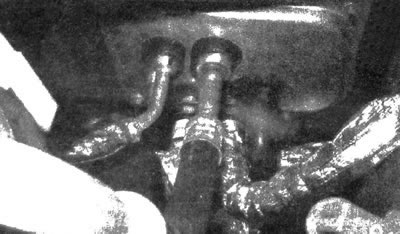 12.3. После разрядки системы кондиционирования отсоедините от патрубков, расположенных на задней перегородке моторного отсека, линии испарителя. Заглушите муфты, чтобы предотвратить проникновение влаги в систему. При необходимости шланги отопителя можно перерезать