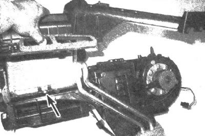 7. Выкрутите винты и разделите составляющие кожуха HVAC. Выкрутите винты и снимите зажимы, затем аккуратно снимите теплообменник отпителя (см. иллюстрации).