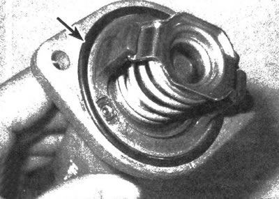 9. Если наружная поверхность термостата, прилегающая к шлангу, подвержена воздействию коррозии, имеет раковины и другие дефекты, то при снятии шланга может произойти ее дальнейшее повреждение. В таком случае необходимо произвести замену кожуха термостата.