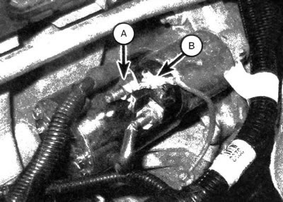 13.3. Открутите гайки и отсоедините от стартера провод аккумулятора (А) и электроклапана (В) (на данном фото представлен вид сверху, при снятом для наглядности впускном коллекторе; снятие производится из-под крыла)