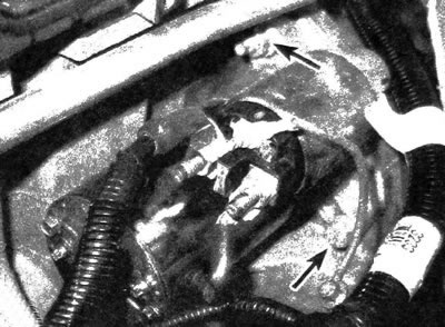 4. Окрутите гайку (верхнюю) и выкрутите болт (нижний), затем снимите стартер из-под крыла (см. иллюстрацию).