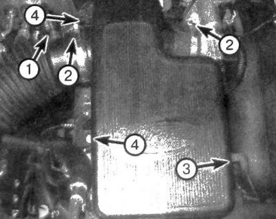 9.6. Элементы резонатора впускного воздуховода: 1. Штекер датчика температуры подаваемого воздуха; 2. Хомуты шлангов; 3. Вакуумная линия регулятора давления топлива; 4. Болты крепления