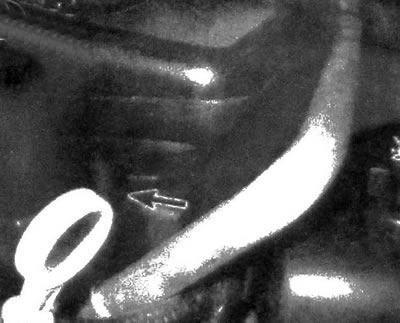 9. Поднимите резонатор и отсоедините от клапанной крышки шланг системы вентиляции картера (см. иллюстрацию).