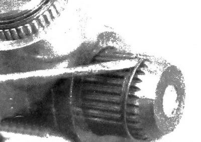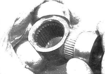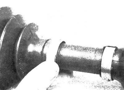 13.4q. Поместите ШРУС на приводной вал, совместив шлицы, затем, воспользовавшись молотком с бойком из мягкого материала, набейте шарнир на вал так, чтобы стопорное кольцо вошло в паз