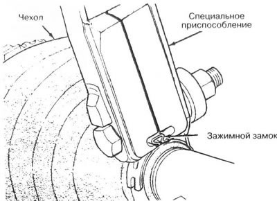 13.4r. Поместите внутренний конец чехла в паз и установите хомут, затем выполните аналогичную операцию на другом конце чехла; затяните хомуты с применением специального приспособления (см. иллюстрацию 13.3t)