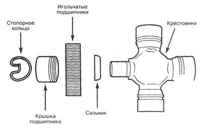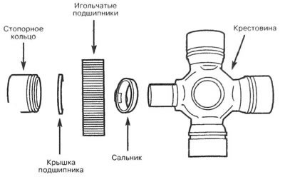 6. Ремкомплект карданного шарнира содержит новую крестовину, сальники, подшипники, крышки и стопорные кольца (см. иллюстрацию).